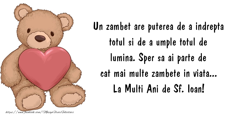 Un zambet are puterea de a indrepta totul si de a umple totul de lumina. Sper sa ai parte de cat mai multe zambete in viata... La Multi Ani de Sf. Ioan!