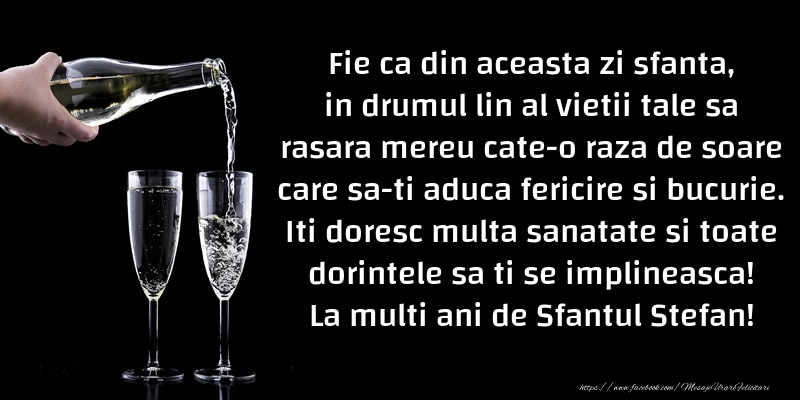 Fie ca din aceasta zi sfanta, in drumul lin al vietii tale sa rasara mereu cate-o raza de soare care sa-ti aduca fericire si bucurie. Iti doresc multa sanatate si toate dorintele sa ti se implineasca! La multi ani de Sfantul Stefan!