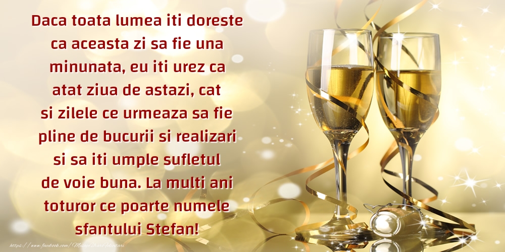 Daca toata lumea iti doreste ca aceasta zi sa fie una minunata, eu iti urez ca atat ziua de astazi, cat si zilele ce urmeaza sa fie pline de bucurii si realizari si sa iti umple sufletul de voie buna. La multi ani toturor ce poarte numele sfantului Stefan!