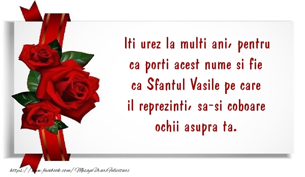 Iti urez la multi ani, pentru ca porti acest nume si fie ca Sfantul Vasile pe care il reprezinti, sa-si coboare ochii asupra ta.