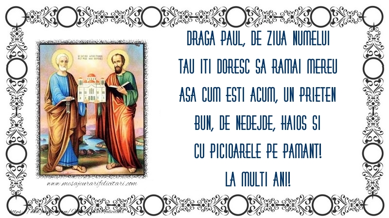 Draga Paul, de ziua numelui tau iti doresc sa ramai mereu asa cum esti acum, un prieten bun, de nedejde, haios si cu picioarele pe pamant! La multi ani!