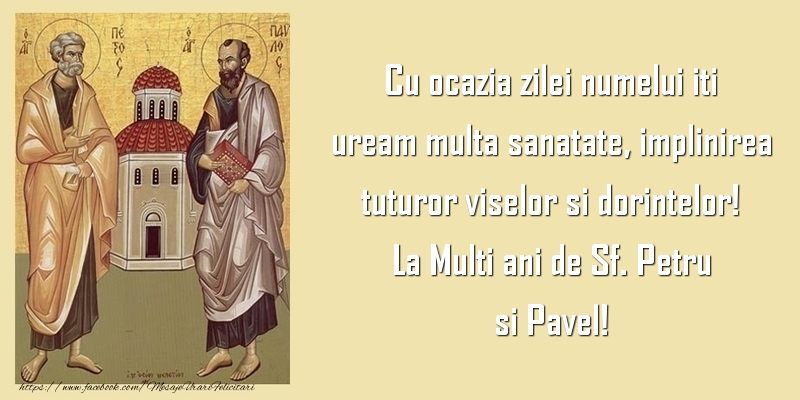 Cu ocazia zilei numelui iti uream multa sanatate, implinirea tuturor viselor si dorintelor! La Multi ani de Sf. Petru si Pavel!
