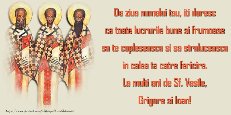 De ziua numelui tau, iti doresc ca toate lucrurile bune si frumoase sa te copleseasca si sa straluceasca in calea ta catre fericire. La multi ani de Sf. Vasile, Grigore si Ioan!