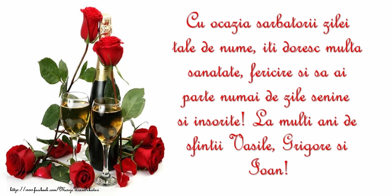 Cu ocazia sarbatorii zilei tale de nume, iti doresc multa sanatate, fericire si sa ai parte numai de zile senine si insorite! La multi ani de sfintii Vasile, Grigore si Ioan!
