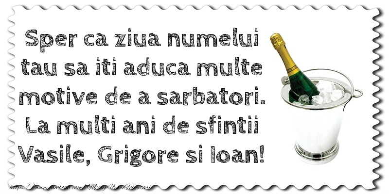 Sper ca ziua numelui tau sa iti aduca multe motive de a sarbatori. La multi ani de sfintii Vasile, Grigore si Ioan!