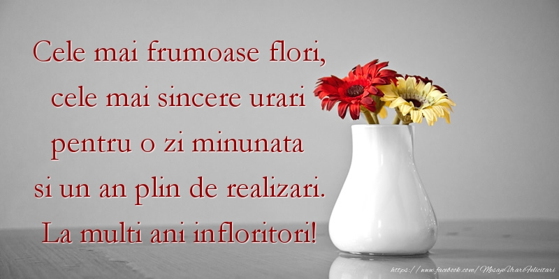 Cele mai frumoase flori, cele mai sincere urari pentru o zi minunata si un an plin de realizari. La multi ani infloritori!