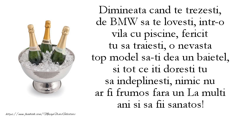 Dimineata cand te trezesti, de BMW sa te lovesti, intr-o vila cu piscine, fericit tu sa traiesti, o nevasta top model sa-ti dea un baietel, si tot ce iti doresti tu sa indeplinesti, nimic nu ar fi frumos fara un La multi ani si sa fii sanatos!