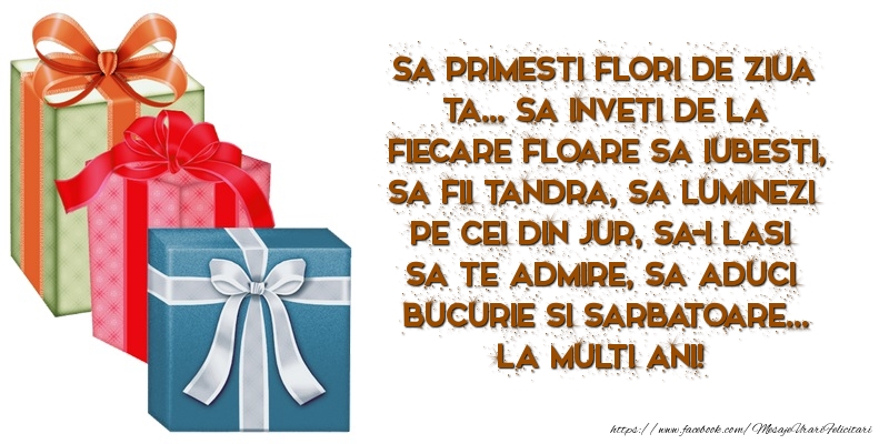 Sa primesti flori de ziua ta... Sa inveti de la fiecare floare sa iubesti, sa fii tandra, sa luminezi pe cei din jur, sa-i lasi sa te admire, sa aduci bucurie si sarbatoare... La multi ani!