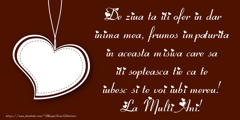 De ziua ta iti ofer in dar inima mea, frumos impaturita in aceasta misiva care sa iti sopteasca tie ca te iubesc si te voi iubi mereu! La Multi Ani!