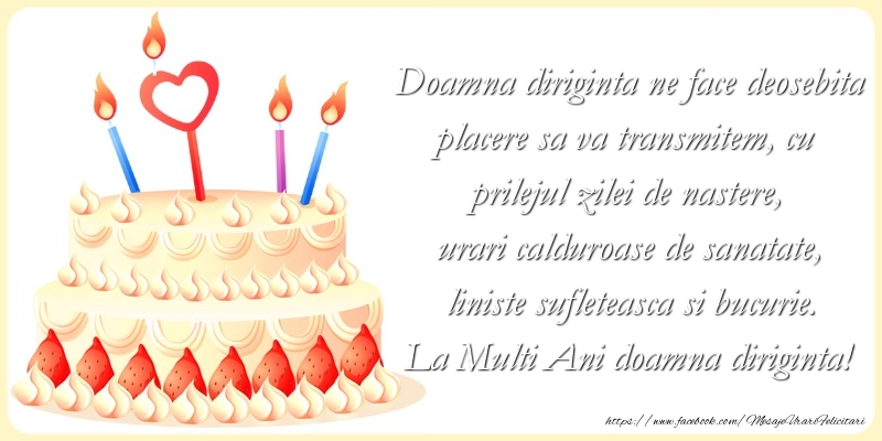 Doamna diriginta ne face deosebita placere sa va transmitem, cu prilejul zilei de nastere, urari calduroase de sanatate, liniste sufleteasca si bucurie. La Multi Ani doamna diriginta!