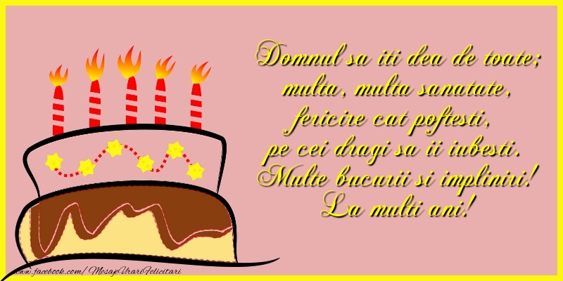 Domnul sa iti dea de toate; multa, multa sanatate, fericire cat poftesti, pe cei dragi sa ii iubesti. Multe bucurii si impliniri! La multi ani!