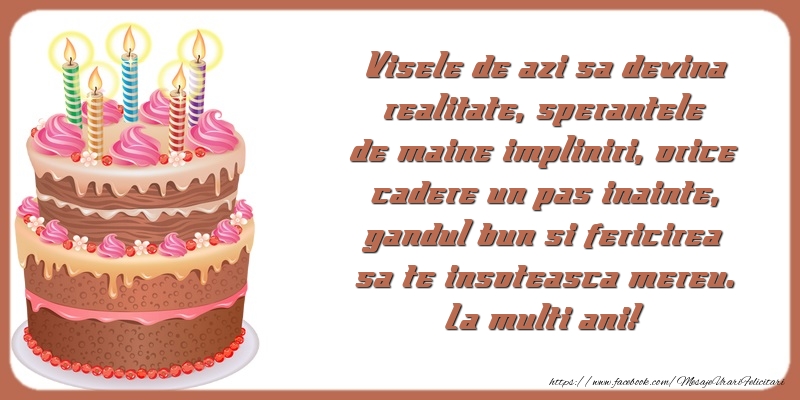 Visele de azi sa devina realitate, sperantele de maine impliniri, orice cadere un pas inainte, gandul bun si fericirea sa te insoteasca mereu. La multi ani!