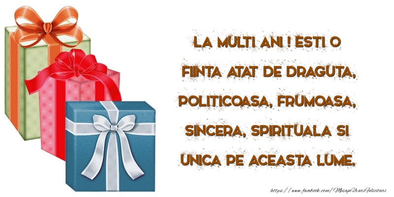 La Multi Ani ! Esti o fiinta atat de draguta, politicoasa, frumoasa, sincera, spirituala si unica pe aceasta lume. Primeste urarile mele de bine si acesta minciuni nevinovate.
