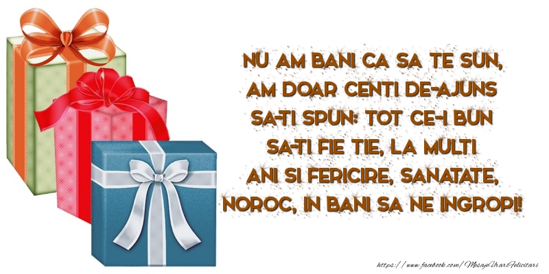 Nu am bani ca sa te sun, am doar centi de-ajuns sa-ti spun: tot ce-i bun sa-ti fie tie, La multi ani si fericire, sanatate, noroc, in bani sa ne ingropi!
