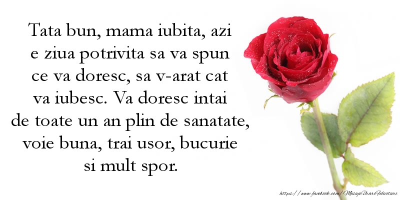 Tata bun, mama iubita, azi e ziua potrivita sa va spun ce va doresc, sa v-arat cat va iubesc. Va doresc intai de toate un an plin de sanatate, voie buna, trai usor, bucurie si mult spor.
