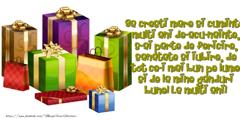 Sa cresti mare si cuminte, multi ani de-acu-nainte, s-ai parte de fericire, sanatate si iubire, de tot ce-i mai bun pe lume si de la mine ganduri bune! La multi ani!
