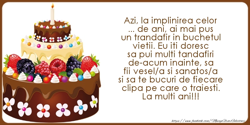 Azi, la implinirea celor ... de ani, ai mai pus un trandafir in buchetul vietii. Eu iti doresc sa pui multi tandafiri de-acum inainte, sa fii vesel/a si sanatos/a si sa te bucuri de fiecare clipa pe care o traiesti. La multi ani!!!