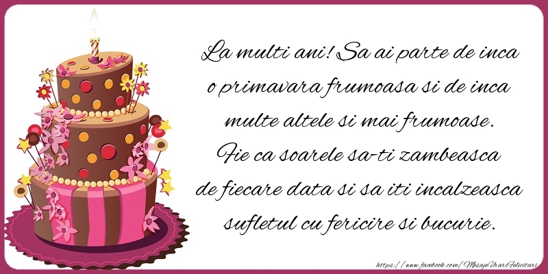 La multi ani! Sa ai parte de inca o primavara frumoasa si de inca multe altele si mai frumoase. Fie ca soarele sa-ti zambeasca de fiecare data si sa iti incalzeasca sufletul cu fericire si bucurie. Sa fii mereu vesela si iubareata si sa traiesti viata din plin.