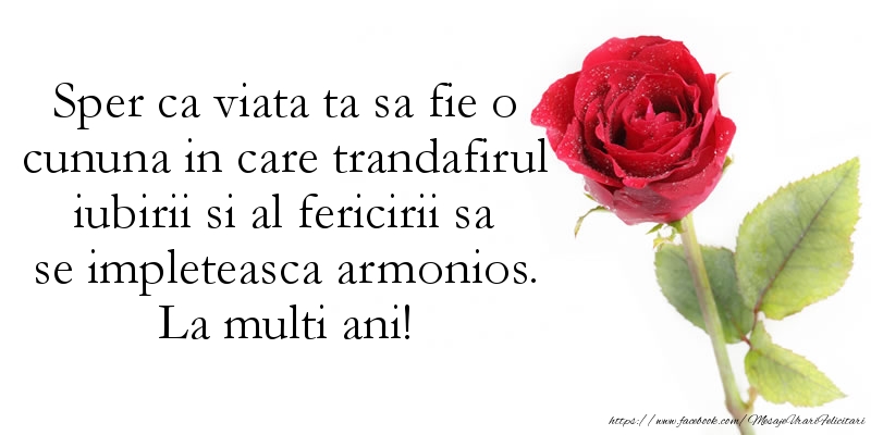 Sper ca viata ta sa fie o cununa in care trandafirul iubirii si al fericirii sa se impleteasca armonios. La multi ani!