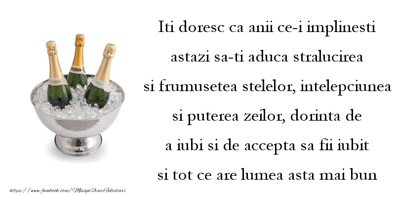 Iti doresc ca anii ce-i implinesti astazi sa-ti aduca stralucirea si frumusetea stelelor, intelepciunea si puterea zeilor, dorinta de a iubi si de accepta sa fii iubit si tot ce are lumea asta mai bun in ea! Si de-ar fi ca zeii sa-mi indeplineasca dorintele iti mai doresc "tinerete fara batrinete si viata fara de moarte!" Multi ani fericiti!
