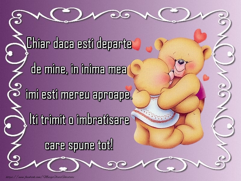Chiar daca esti departe de mine, in inima mea imi esti mereu aproape. Iti trimit o imbratisare care spune tot!