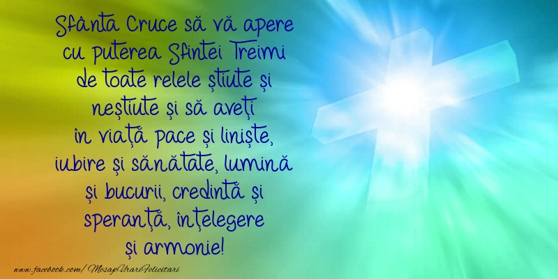 Sfânta Cruce să vă apere cu puterea Sfintei Treimi de toate relele știute și neștiute și să aveți în viață pace și liniște, iubire și sănătate, lumină și bucurii, credintă și speranță, înțelegere și armonie!