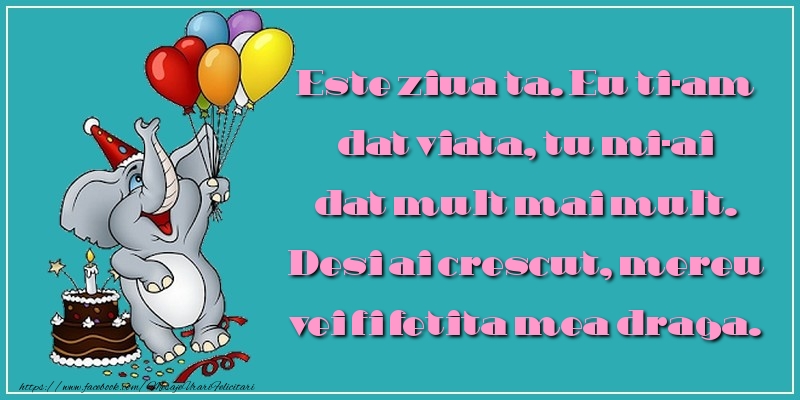 Este ziua ta. Eu ti-am dat viata, tu mi-ai dat mult mai mult. Desi ai crescut, mereu vei fi fetita mea draga. La Multi Ani!
