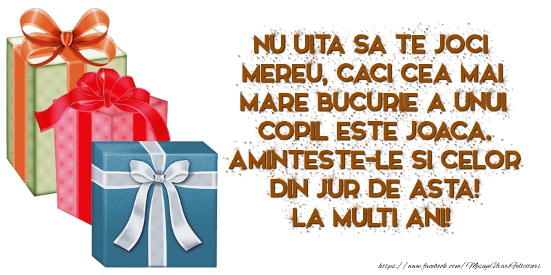 Nu uita sa te joci mereu, caci cea mai mare bucurie a unui copil este joaca. Aminteste-le si celor din jur de asta! La multi ani!