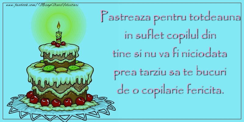 Pastreaza pentru totdeauna in suflet copilul din tine si nu va fi niciodata prea tarziu sa te bucuri de o copilarie fericita. La multi ani, copilul meu drag!