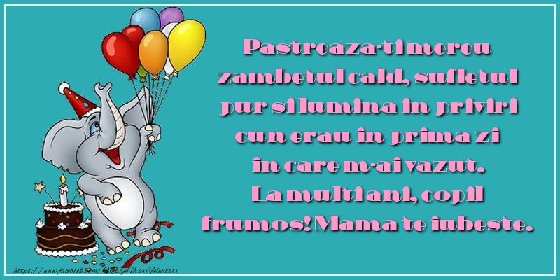 Pastreaza-ti mereu zambetul cald, sufletul pur si lumina in priviri cun erau in prima zi in care m-ai vazut. La multi ani, copil frumos! Mama te iubeste.
