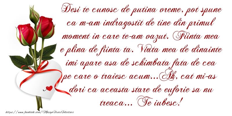 Desi te cunosc de putina vreme, pot spune ca m-am indragostit de tine din primul moment in care te-am vazut. Fiinta mea e plina de fiinta ta. Viata mea de dinainte imi apare asa de schimbata fata de cea pe care o traiesc acum...Ah, cat mi-as dori ca aceasta stare de euforie sa nu treaca... Te iubesc!