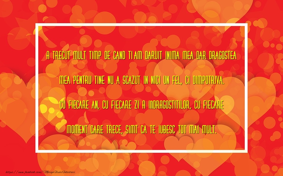A trecut mult timp de cand ti-am daruit inima mea dar dragostea mea pentru tine nu a scazut in nici un fel, ci dimpotriva. Cu fiecare an, cu fiecare ZI A INDRAGOSTITILOR, cu fiecare moment care trece, simt ca te iubesc tot mai mult.