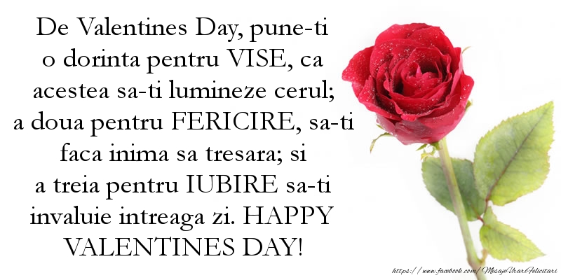 De Valentines Day, pune-ti o dorinta pentru VISE, ca acestea sa-ti lumineze cerul; a doua pentru FERICIRE, sa-ti faca inima sa tresara; si a treia pentru IUBIRE sa-ti invaluie intreaga zi. HAPPY VALENTINES DAY!