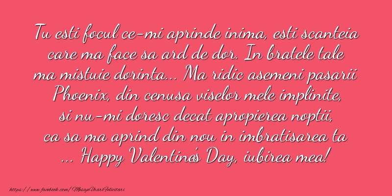 Tu esti focul ce-mi aprinde inima, esti scanteia care ma face sa ard de dor. In bratele tale ma mistuie dorinta... Ma ridic asemeni pasarii Phoenix, din cenusa viselor mele implinite, si nu-mi doresc decat apropierea noptii, ca sa ma aprind din nou in imbratisarea ta ... Happy Valentine’s Day, iubirea mea!