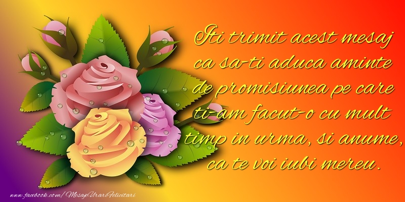 Iti trimit acest mesaj ca sa-ti aduca aminte de promisiunea pe care ti-am facut-o cu mult timp in urma, si anume, ca te voi iubi mereu. Sper ca in anii ce vin sa ma ajuti, ca si pana acum, sa-mi tin cuvantul.