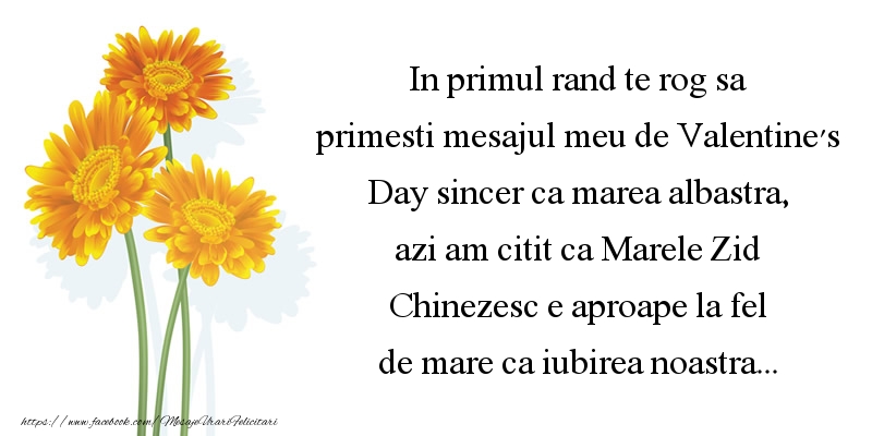 In primul rand te rog sa primesti mesajul meu de Valentine's Day sincer ca marea albastra, azi am citit ca Marele Zid Chinezesc e aproape la fel de mare ca iubirea noastra...