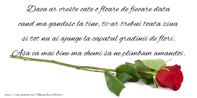 Daca ar creste cate o floare de fiecare data cand ma gandesc la tine, ti-ar trebui toata ziua si tot nu ai ajunge la capatul gradinii de flori. Asa ca mai bine ma chemi sa ne plimbam amandoi.