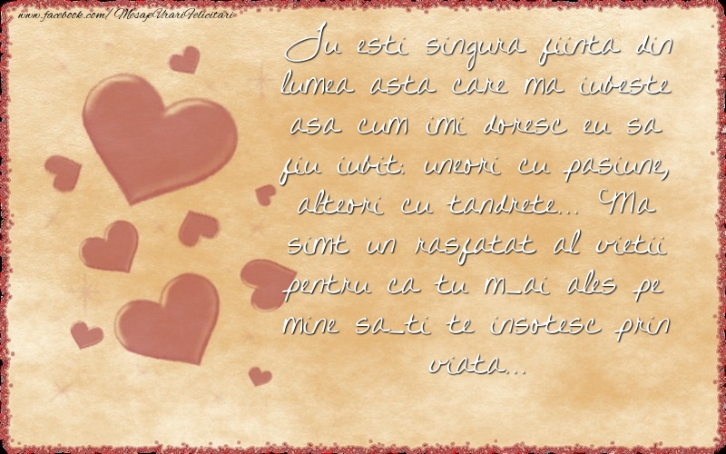 Tu esti singura fiinta din lumea asta care ma iubeste asa cum imi doresc eu sa fiu iubit: uneori cu pasiune, alteori cu tandrete... Ma simt un rasfatat al vietii pentru ca tu m-ai ales pe mine sa-ti te insotesc prin viata...